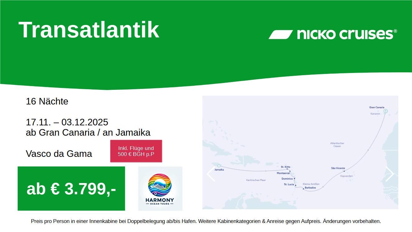 Wir haben ständig eine fünfstellige Zahl an Kreuzfahrten für Sie buchbar. Aus dieser unendlichen Fülle suchen wir Ihnen immer wieder interessante Routenhighlights heraus. Unsere Stärke liegt darin, dass wir Ihnen immer ein individuelles Erlebnis zusammenstellen können. Dafür haben wir auch unbekanntere, internationale Veranstalter im Programm.